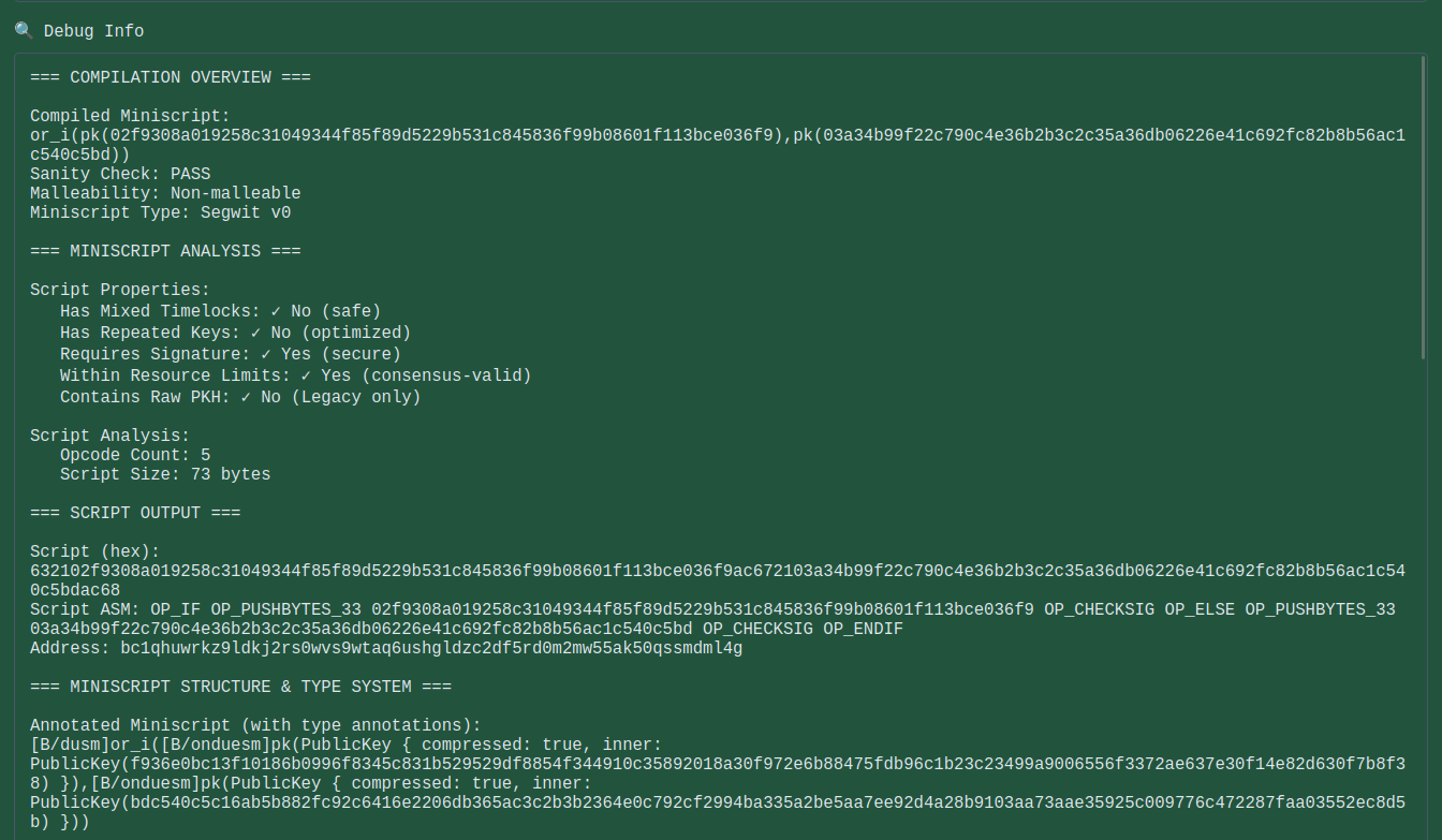 After a successful compilation, you can press the debug button 🐞 to see more information returned from the Miniscript Rust library compilation, including Miniscript types.