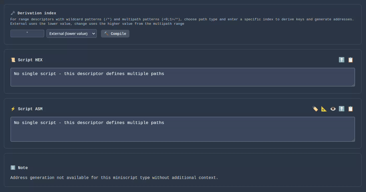 Miniscript Studio supports hierarchical deterministic (HD) wallet descriptors, including xpubs and tpubs. When range descriptors are used, the editor provides an index field for address derivation and supports multipath syntax for external/change branches. This way you can work with complex expressions with multiple descriptors without the hassle to edit the expression.