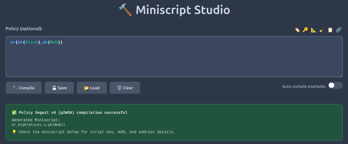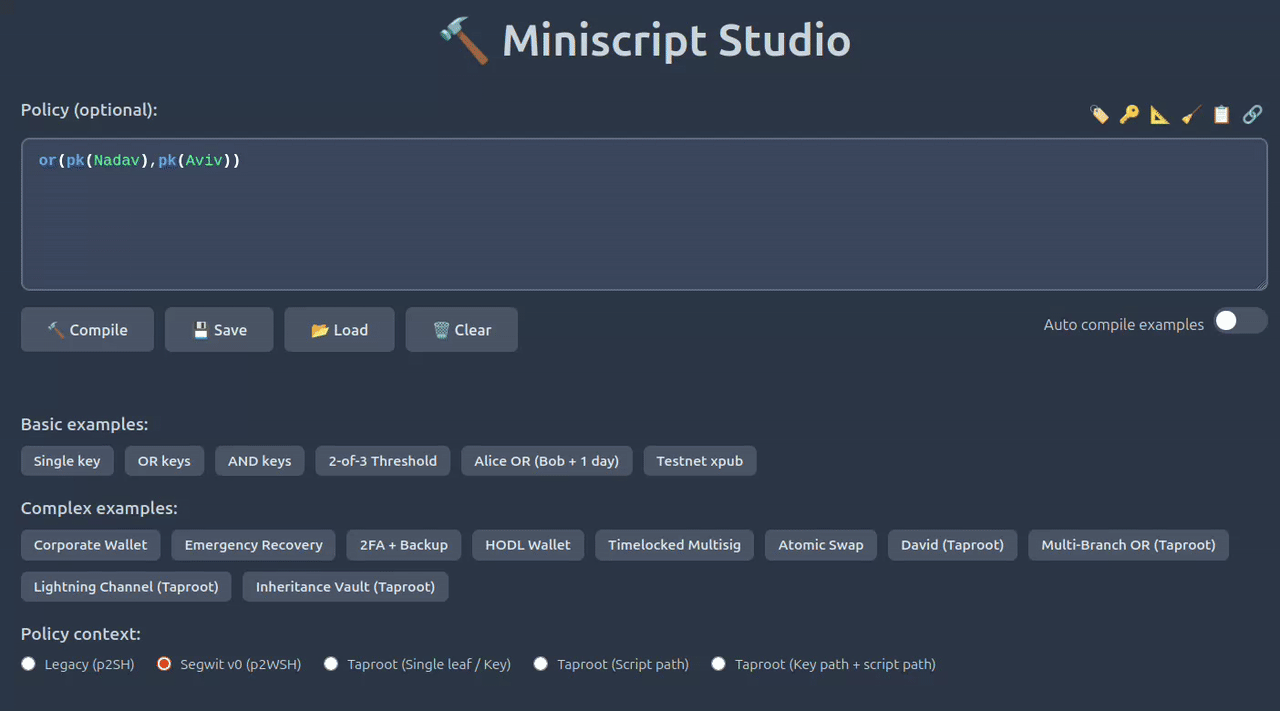 The Policy Editor is the starting point for writing spending conditions in a high level, human readable format. You can load predefined examples, study their descriptions, and compile them into Miniscript and Bitcoin Script. Just choose an example, press compile, and scroll down for Miniscript details. Compile policy will always trigger Miniscript compile, unless it's a Taproot with more than one branch to select. Read the example descriptions as they cover all technical aspects of the example. You can collapse descriptions to save space.