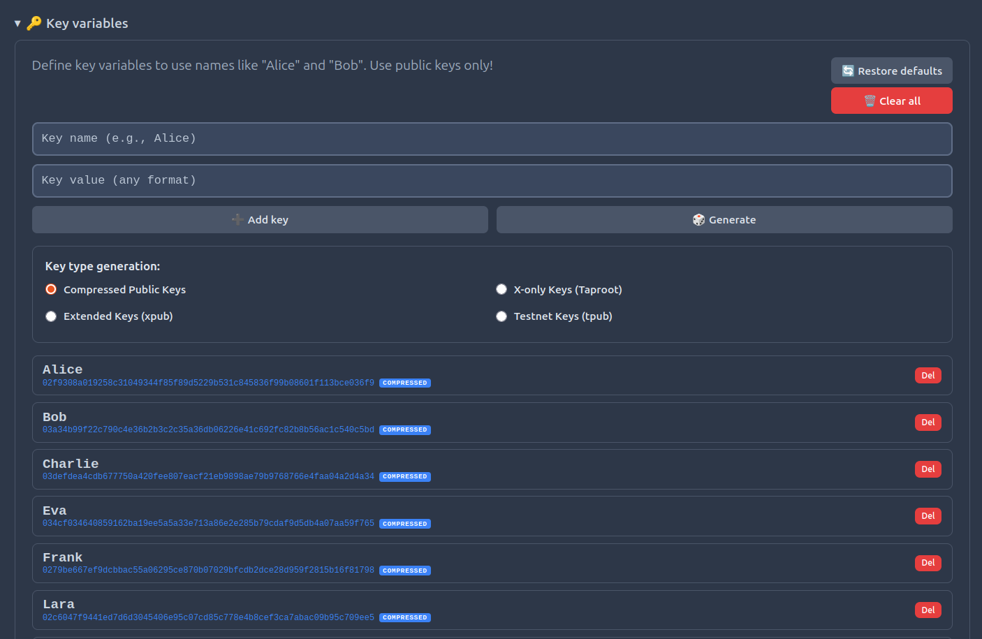 Miniscript Studio comes with predefined example keys to help you get started immediately: Alice, Bob, Charlie, Dave, Eva etc. You can see the full list under the key variable section.