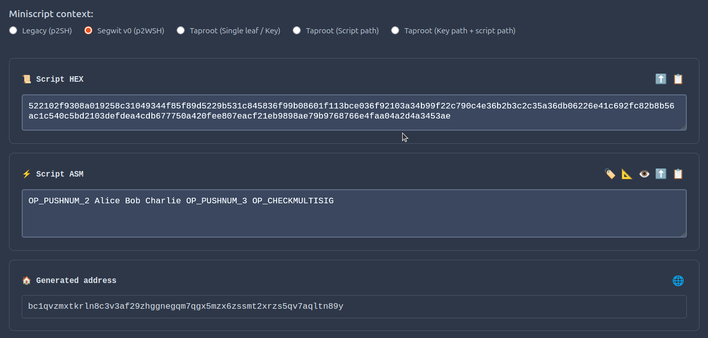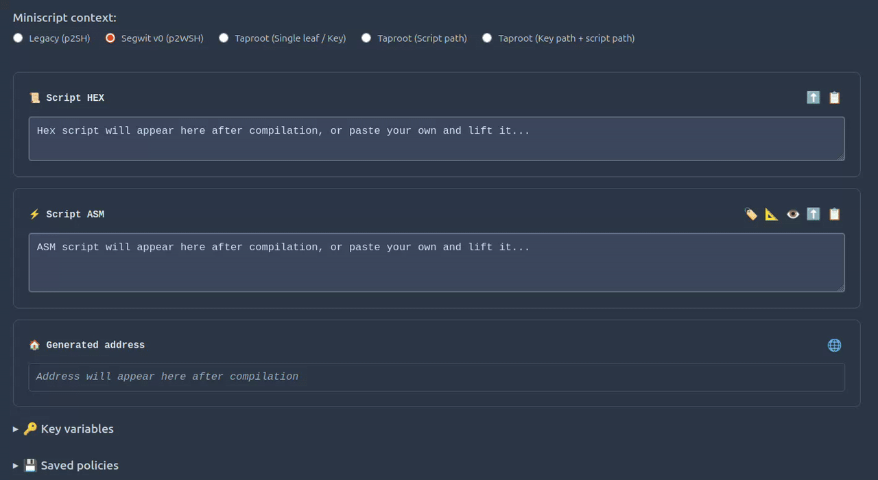 The Script Area displays the compiled result in multiple formats: hex, ASM, and as an address. You can toggle between mainnet and testnet, or switch between Legacy, SegWit, and Taproot contexts and compile again. Note that Taproot uses x-only keys, make sure to choose the right context to your keys.