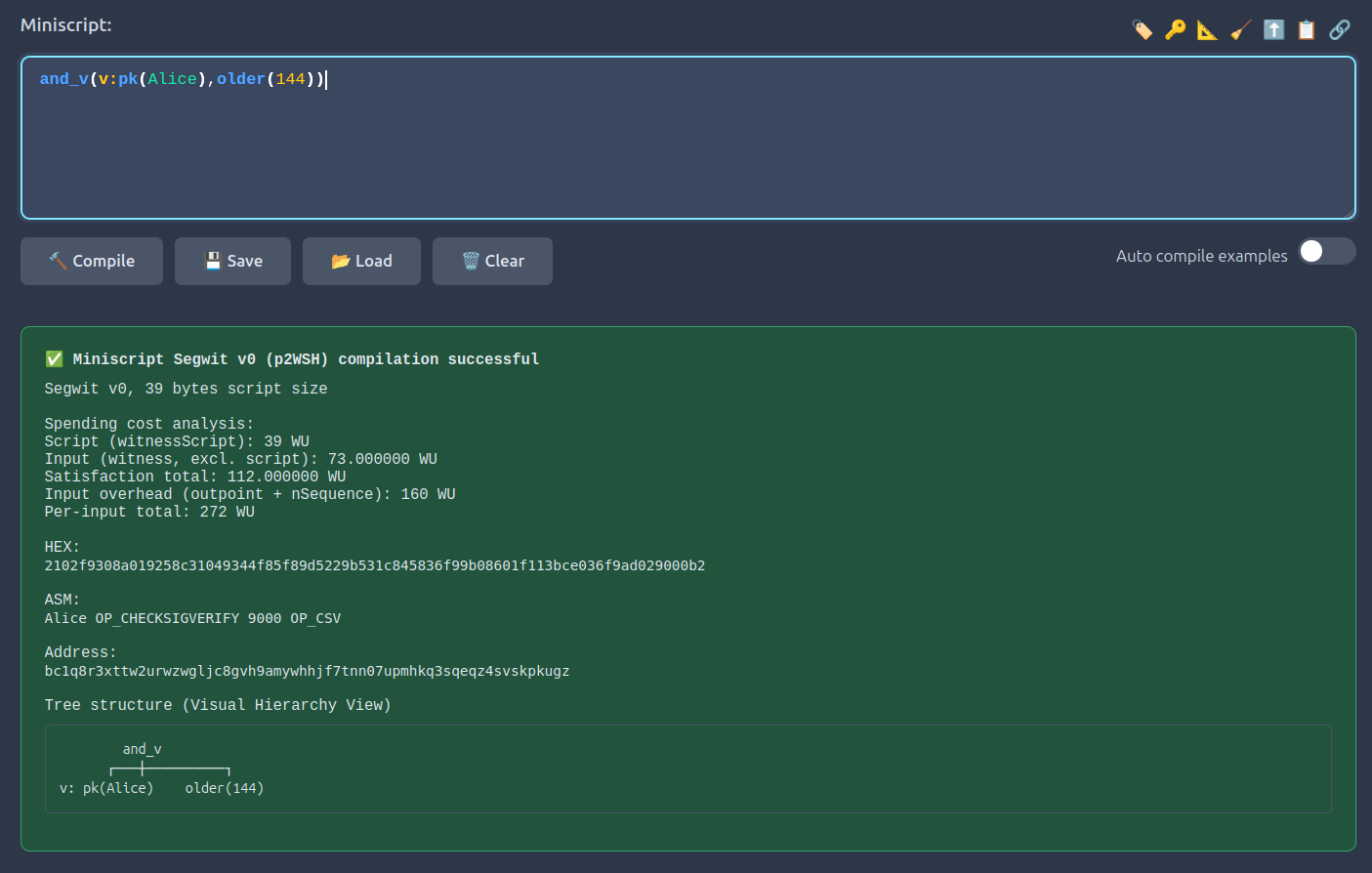 For example, pasting the ASM βAlice OP_CHECKSIG OP_IFDUP OP_NOTIF Bob OP_CHECKSIGVERIFY 144 OP_CHECKSEQUENCEVERIFY OP_ENDIFβ produces the Miniscript βor_d(pk(Alice),and_v(v:pk(Bob),older(144)))β and the higher-level policy βor(pk(Alice),and(pk(Bob),older(144)))β. This makes complex raw scripts far easier to understand.