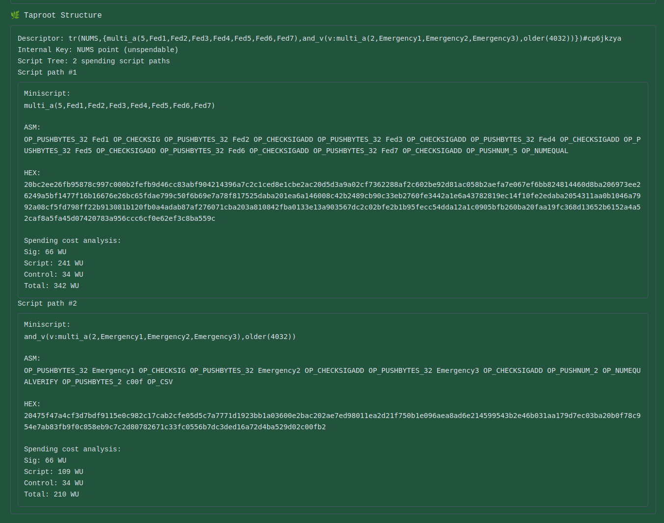 The miniscript expression βor_d(multi_a(5,Fed1,Fed2,Fed3,Fed4,Fed5,Fed6,Fed7),and_v(v:multi_a(2,Emergency1,Emergency2,Emergency3),older(4032)))β is displayed as two paths: multi_a(5,Fed1,Fed2,Fed3,Fed4,Fed5,Fed6,Fed7) and and_v(v:multi_a(2,Emergency1,Emergency2,Emergency3),older(4032)), with their descriptors and weight analysis provided side by side for comparison. Script path will use NUMS to generate script only paths; Script + key path will generate script paths and key paths spending; and Single leaf will create a Taproot leaf with the full script for complex scripts. For key only scripts, it will create a key-only spending path as it's the most efficient.