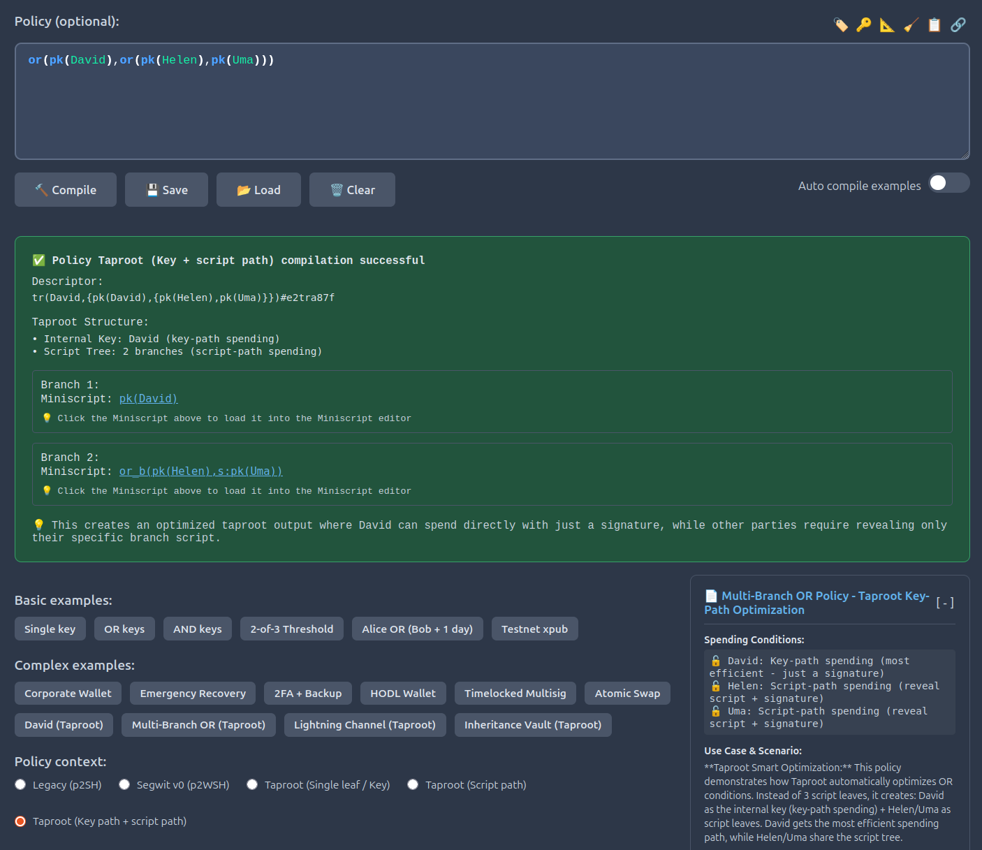 Taproot introduced new ways of structuring Bitcoin outputs, and Miniscript Studio provides full support for exploring them. You can load Taproot policy examples and compile them in single-leaf/key, script-path, or key+script path contexts.